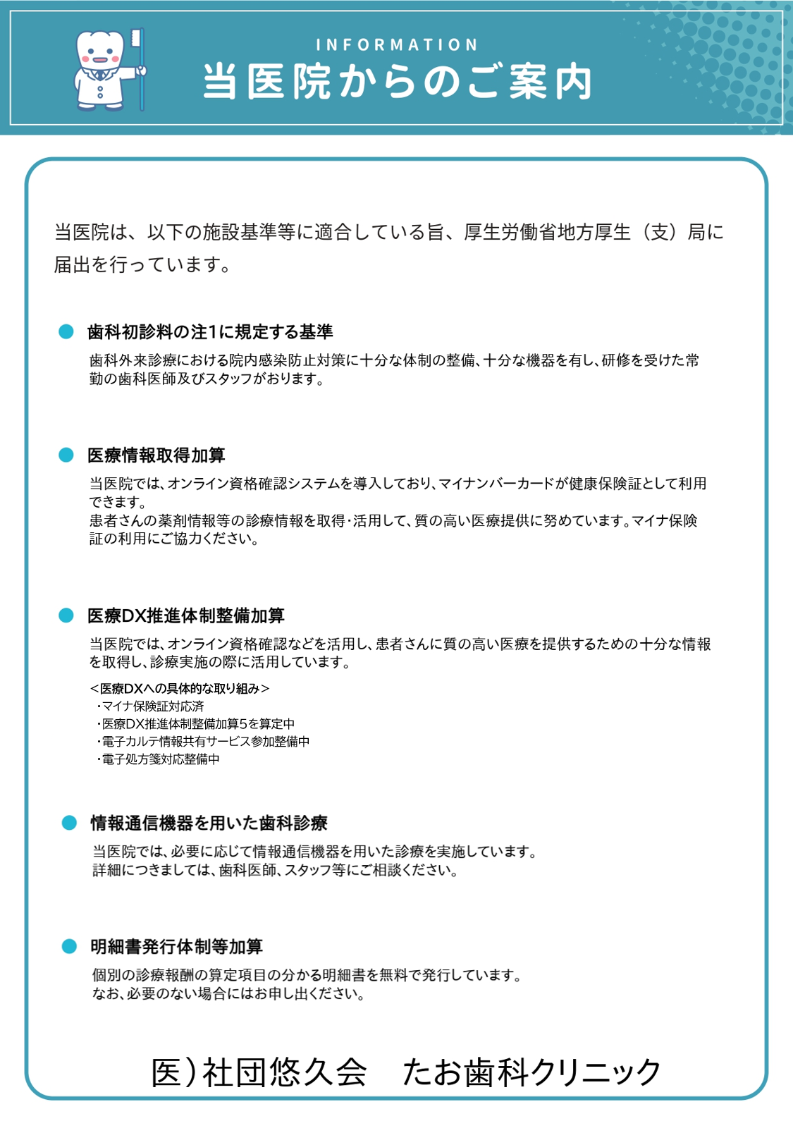 保険医療機関における書面掲示 当医院からのご案内 当医院は、以下の施設基準に適合している旨、 厚生労働省地方厚生 (支)局に届出を行っています。 当院の歯科医師会登録ページはこちら 当医院では診療情報の文書提供に努めています。